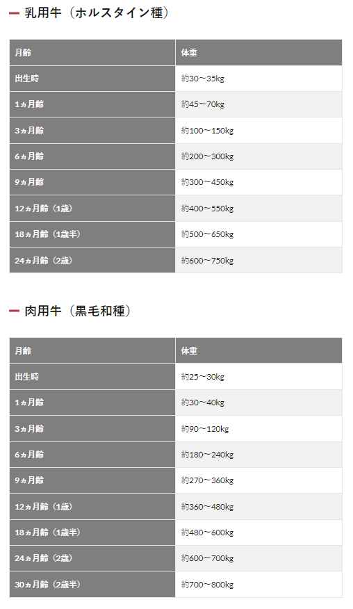 月齢ごとの体重早見表を参考にすることも、一つの方法です。ここではホルスタイン種と黒毛和種の月齢ごとの体重目安を示します。